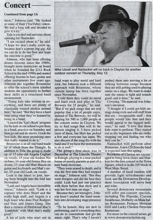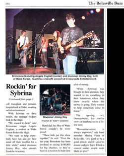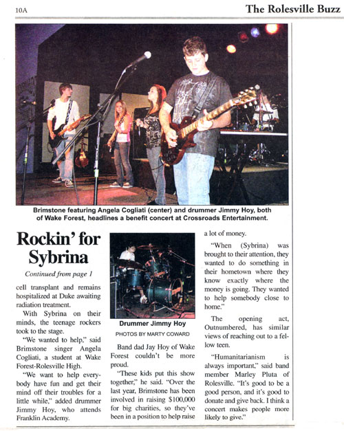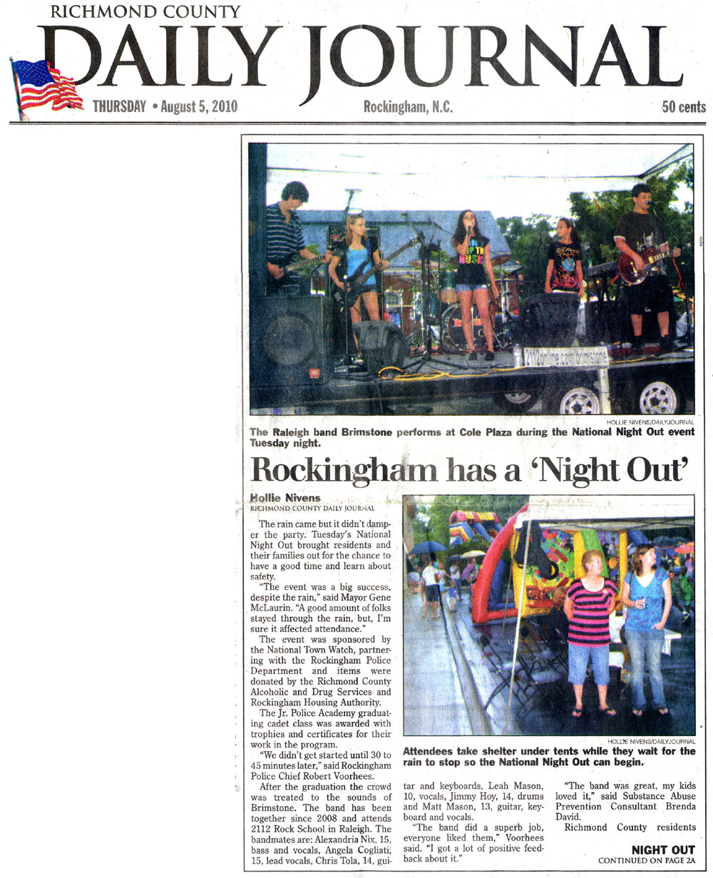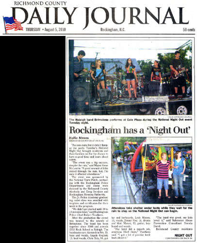 Official Brimstone Reverbnation Page IMAGES Sycamore Creek Elementary - Raleigh 04/29/11 Litchford Village Shopping Center Harvest Festival 10/30/10 Wake Forest with Nantucket 9/25/10 Ray Price Capital City Bike Fest - Raleigh 9/25/10 Carrington Pavilion - Danville VA 9/18/10 Wool E. Bull sittin' in with the band - Wake Forest 9/19/10 Wake Forest with Band Of Oz 6/1/10 Clayton with Nantucket 4/13/10 AUDIO